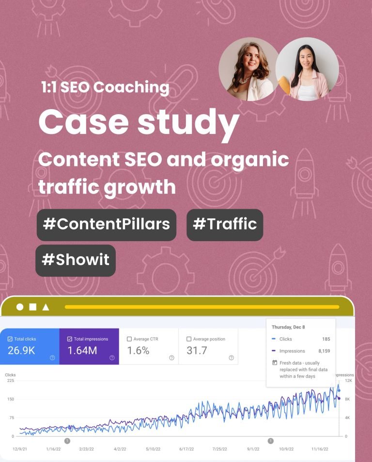 📈 1:1 SEO coaching with Kristin Pruis, branding and Showit web designer. Focus areas were content pillars, traffic growth, and digital product sales.