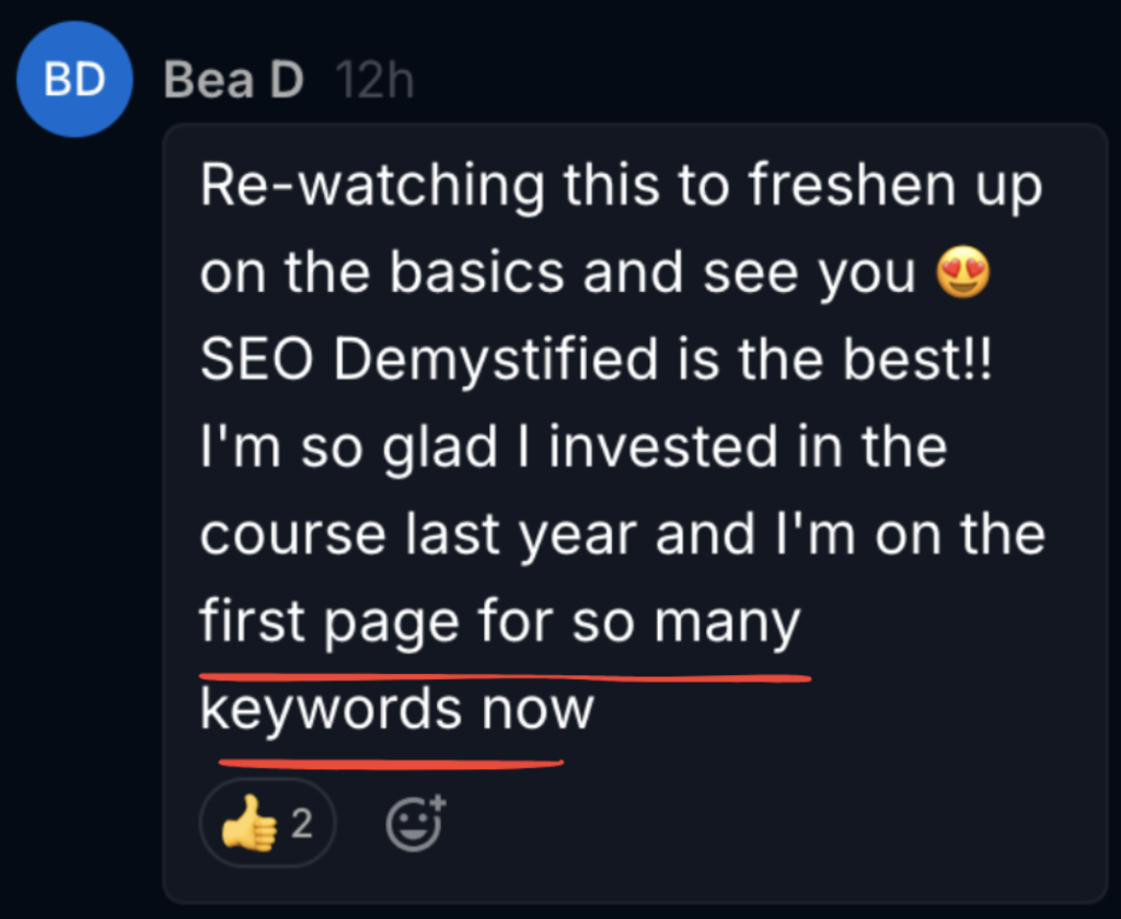 “I’m a graphic designer on a marketing team by day and I’ve never understood SEO. I found it overwhelming and I had NO IDEA how to go about searching for information and implementing. Your course made it SO easy and understandable! I appreciate the bite size videos that walked me through each step and strategy.”