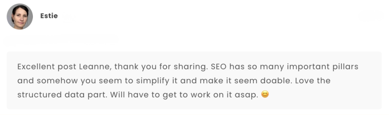 “Leanne’s 1-1 SEO coaching is amazing! By learning what SEO efforts to focus on and having her guidance every step of the way to implement things myself, I have already seen more results with my organic traffic in 4 weeks than I did from paying someone else an entire year. I am blown away by the value that Leanne shares in our sessions and I am so happy that I decided to make the investment. I would recommend Leanne to anyone who wants to take their SEO into their own hands and needs guidance on what to focus on.”
